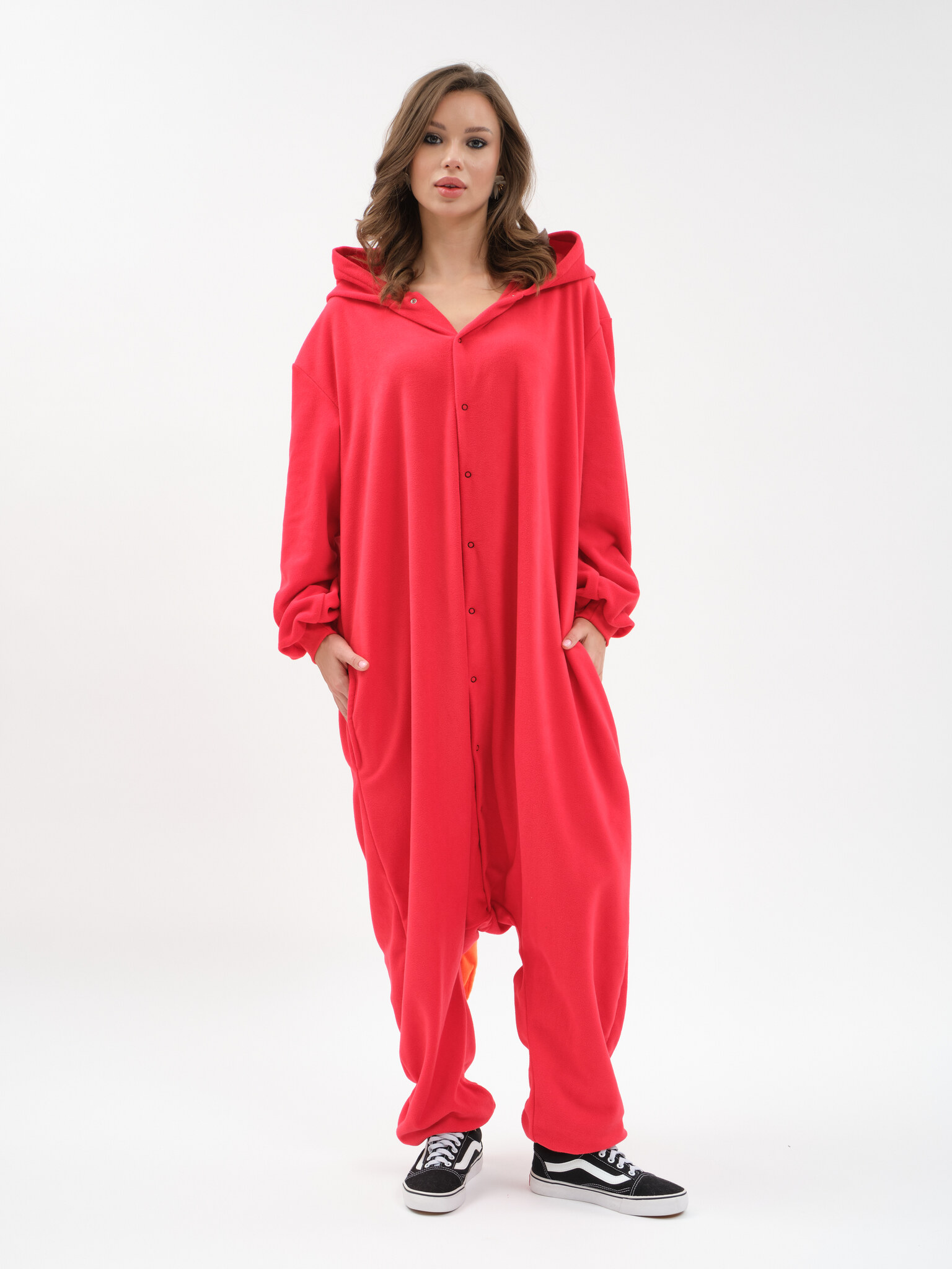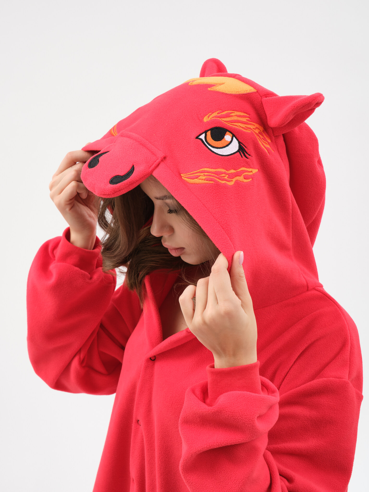 Продуманный дизайн. Удобная конструкция на кнопках позволяет легко надевать и снимать костюм. Вышивка мордочки и пламенных элементов придает костюму особую выразительность и реалистичность.